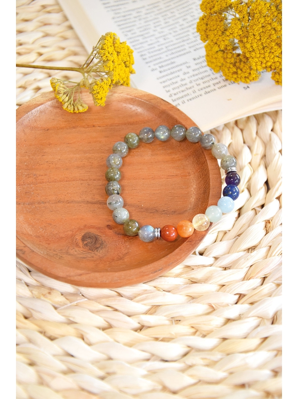 Bracelet élastique en pierres naturelles composé de perles rondes en labradorite et de 7 perles aux couleurs des 7 chakras principaux : jaspe rouge, calcite orange, citrine (améthyste chauffée), aventurine verte, aigue-marine, lapis-lazuli et améthyste. Célèbre pour ses capacités de protection, la labradorite crée un bouclier contre les influences négatives. Elle est ainsi appelée pierre des thérapeutes. C’est aussi une pierre qui développe l’intuition et qui apporte de l'harmonie dans les relations humaines.